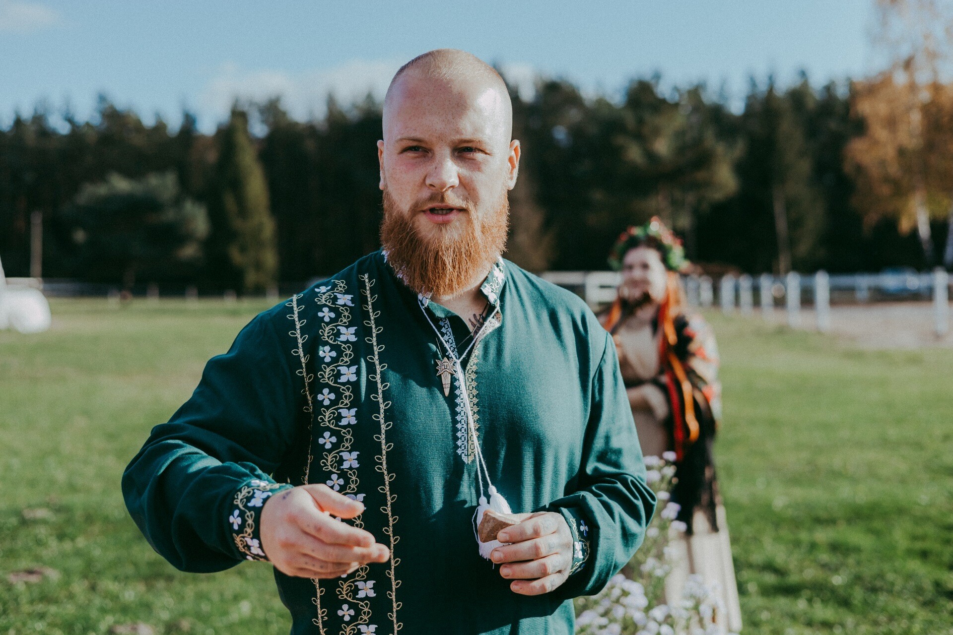 Ceremonia zaczęła się nie od słów, ale od gestu. Beata i Maciej stanęli naprzeciw siebie – w pełnym słońcu, pod błękitnym niebem, otoczeni naturą i gośćmi, którzy patrzyli w ciszy. Obok nich stał mistrz ceremonii – starszy, brodaty mężczyzna w haftowanej tunice. Z jego twarzy bił spokój i powaga.